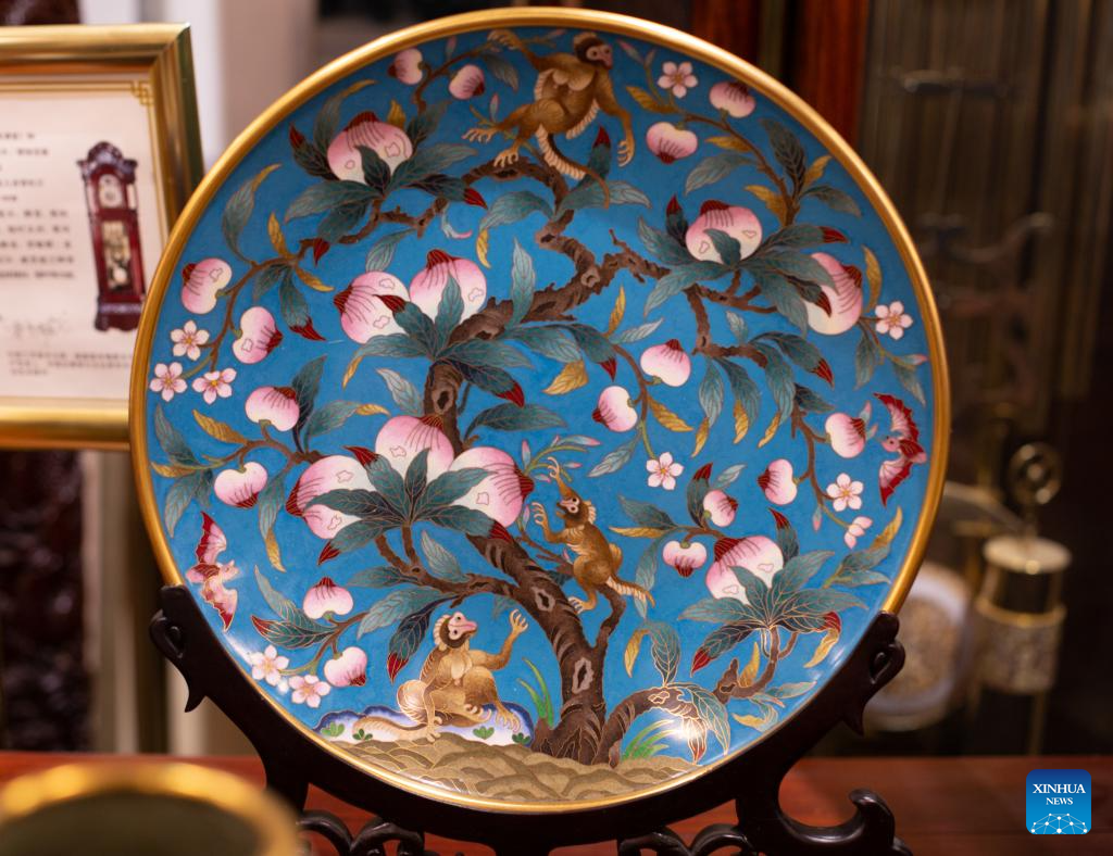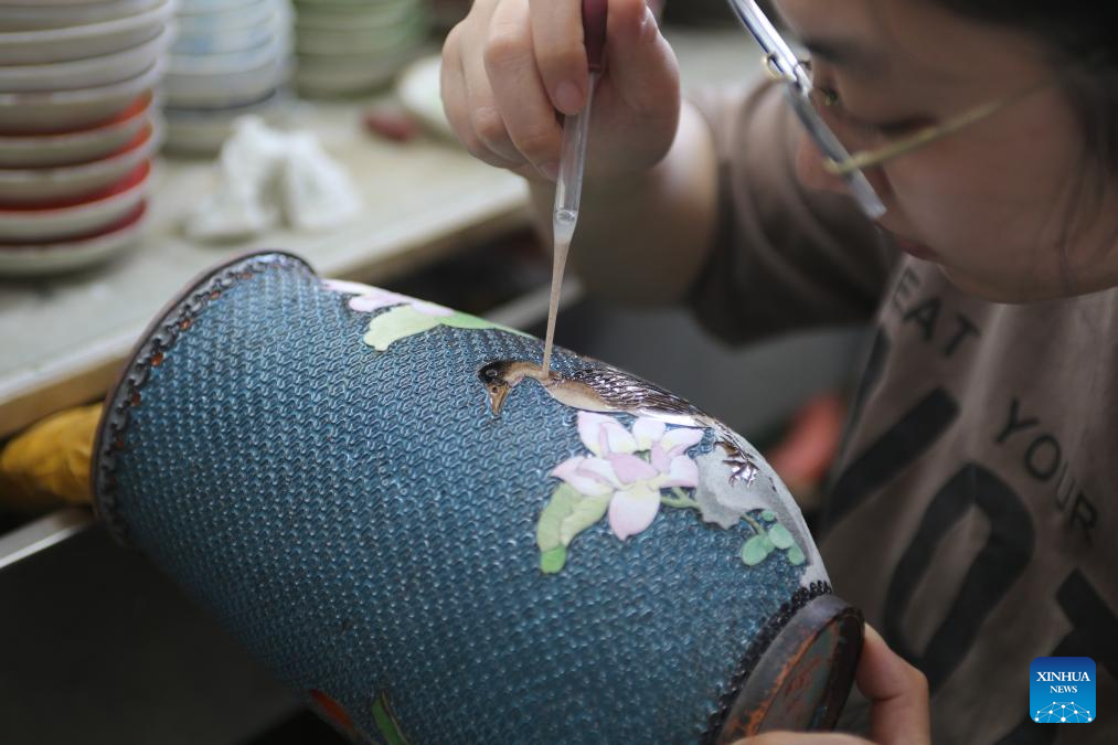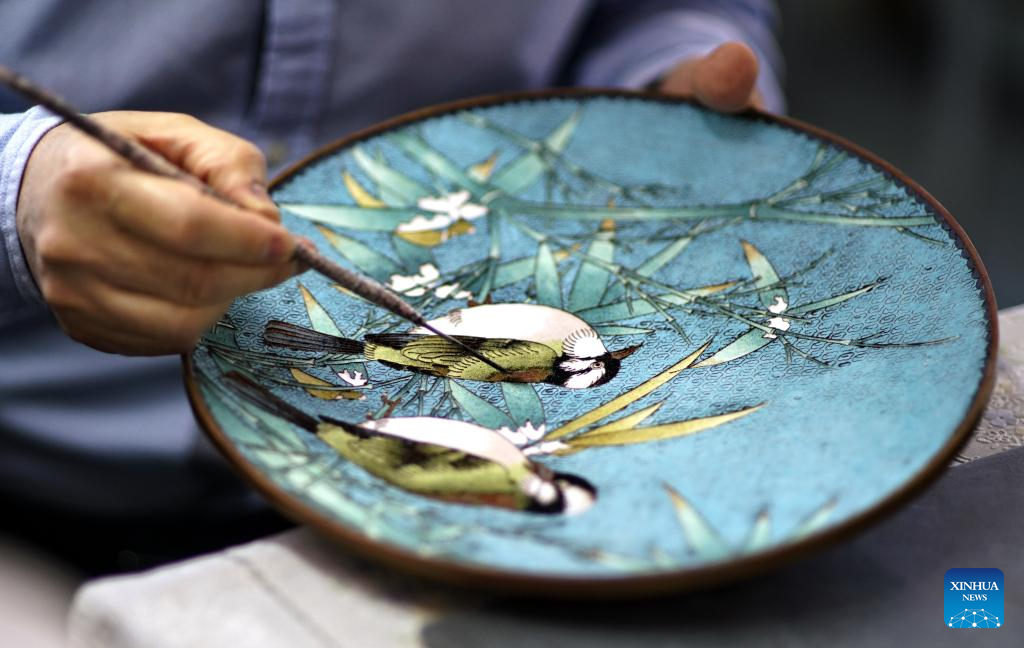 A piece of Jingtailan artwork is displayed at Beijing Enamel Factory in Beijing, capital of China, May 15, 2024. (Xinhua/Tian Weiwei)
