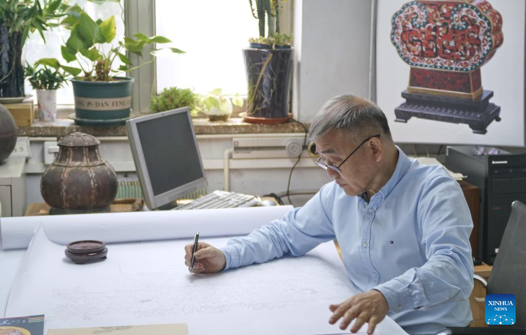 Zhong Liansheng works on a large scale pattern of Jingtailan artwork at his workshop of Beijing Enamel Factory in Beijing, capital of China, May 15, 2024. (Xinhua/Li Xin)