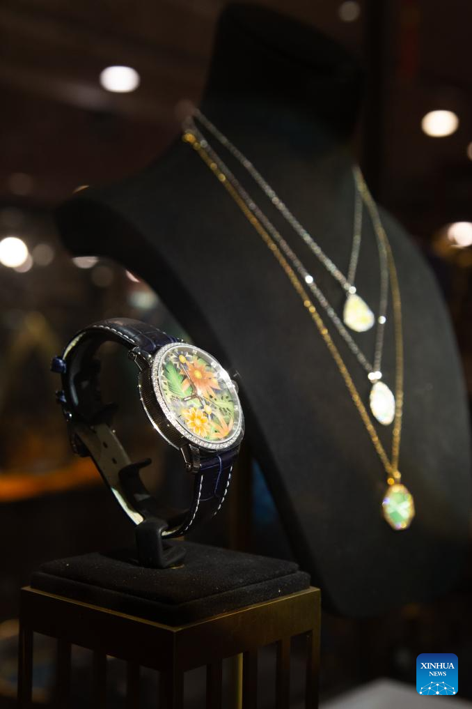 This photo taken on May 15, 2024 shows a watch made with Jingtailan technique displayed at the Beijing Enamel Factory in Beijing, capital of China. (Xinhua/Tian Weiwei)