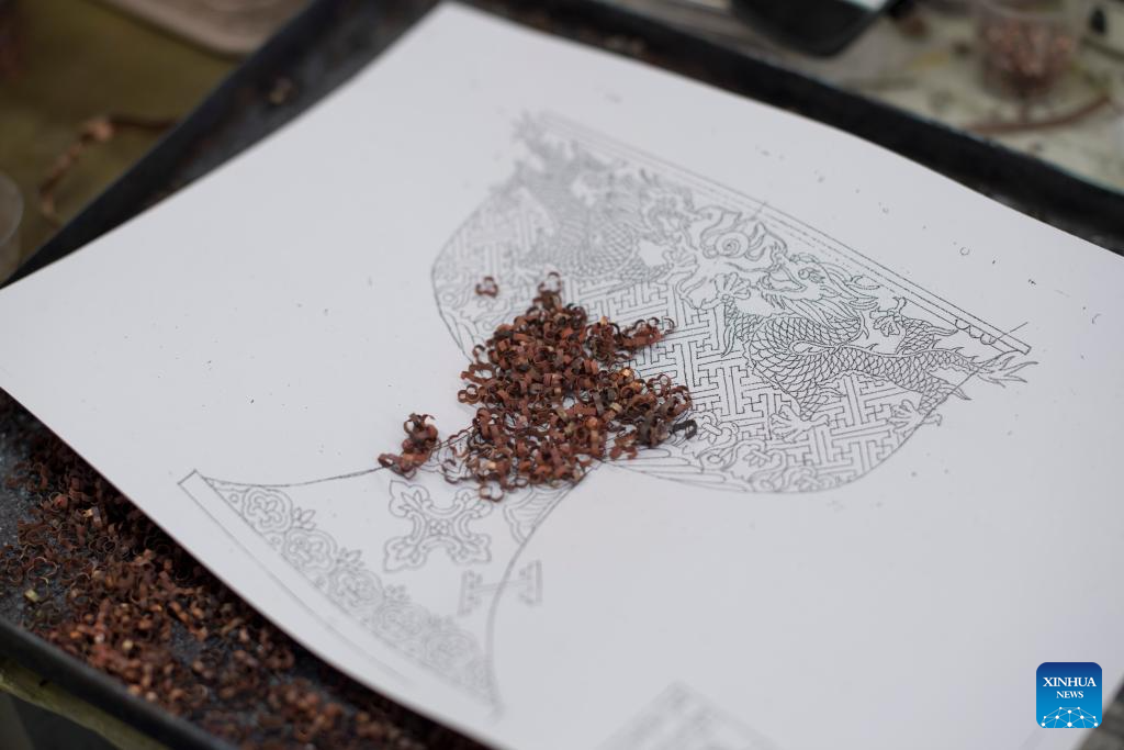 A designed pattern of Jingtailan and shaped copper wires are pictured at Beijing Enamel Factory in Beijing, capital of China, May 15, 2024. (Xinhua/Zhang Haofu)