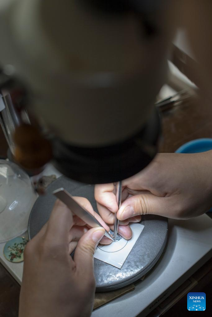 A craftsman makes Jingtailan patterns on a dial under a microscope at Beijing Enamel Factory in Beijing, capital of China, May 15, 2024. (Xinhua/Zhang Haofu)