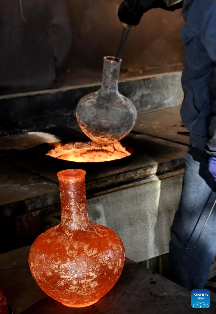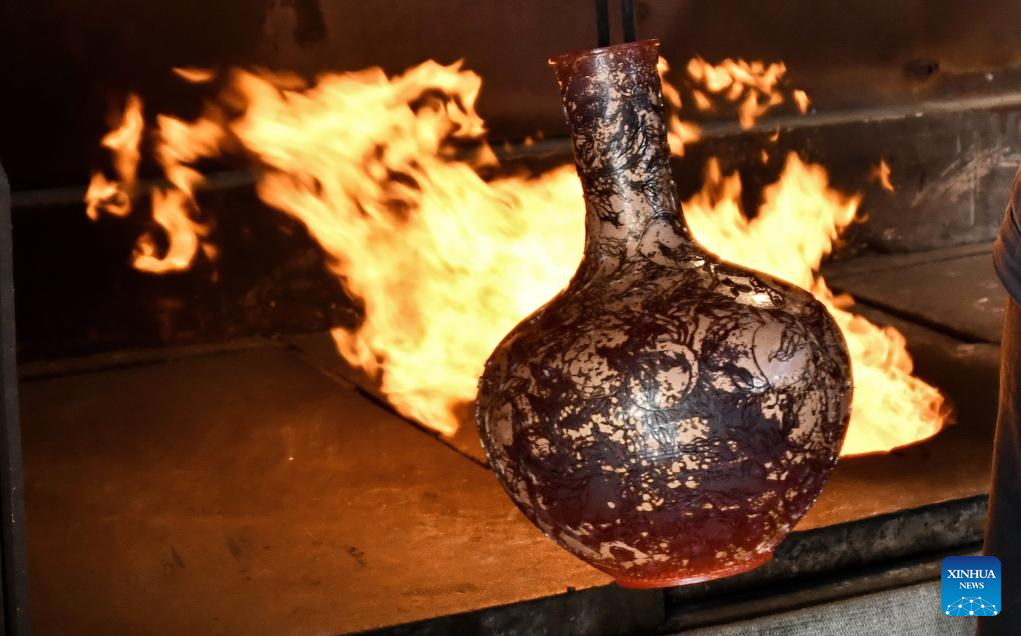 This photo taken on Dec. 12, 2019 shows Jingtailan artwork in making in fire at Beijing Enamel Factory in Beijing, capital of China. (Xinhua/Li Xin)