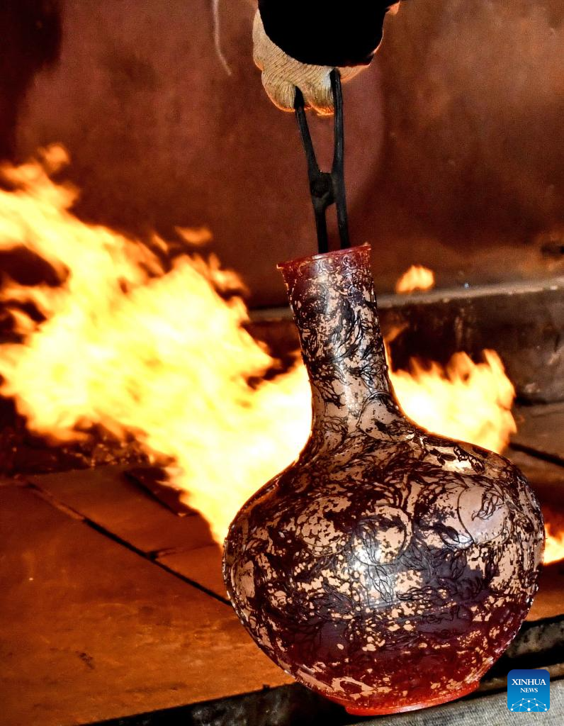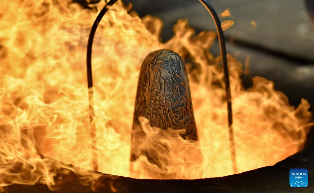 This photo taken on Dec. 12, 2019 shows a piece of Jingtailan artwork being burnt in fire at Beijing Enamel Factory in Beijing, capital of China.(Xinhua/Li Xin)