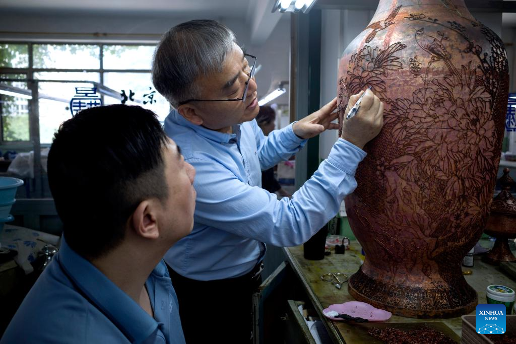 Zhong Liansheng and a craftsman apply filigree on Jingtailan artwork at Beijing Enamel Factory in Beijing, capital of China, May 15, 2024. Introduced from the Arabian countries during the Yuan Dynasty (1271-1368) and became popular during the "Jingtai" years of the Ming Dynasty (1368-1644), "Jingtailan" represents a special localized cloisonne wrought of copper and porcelain.