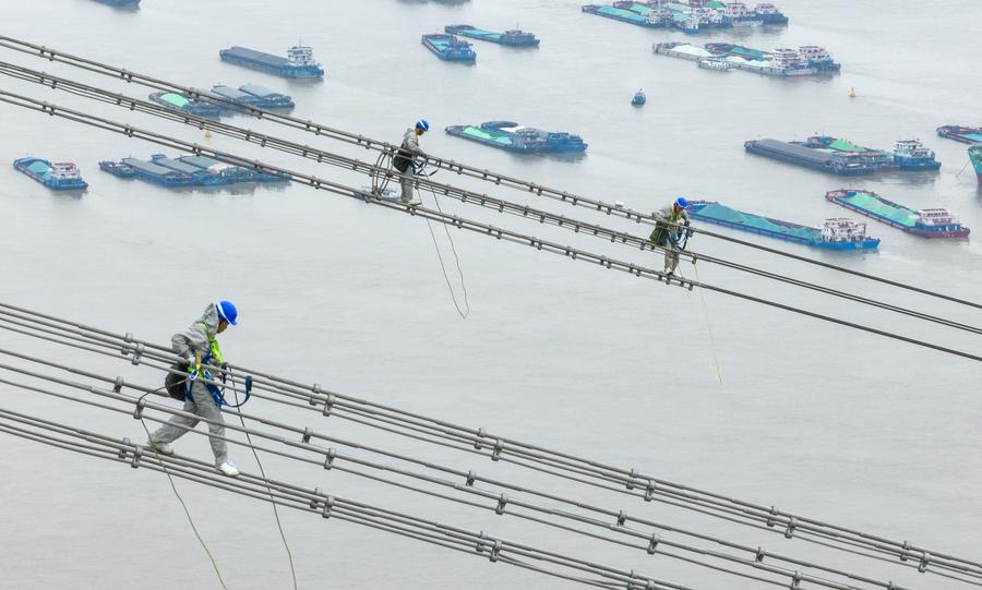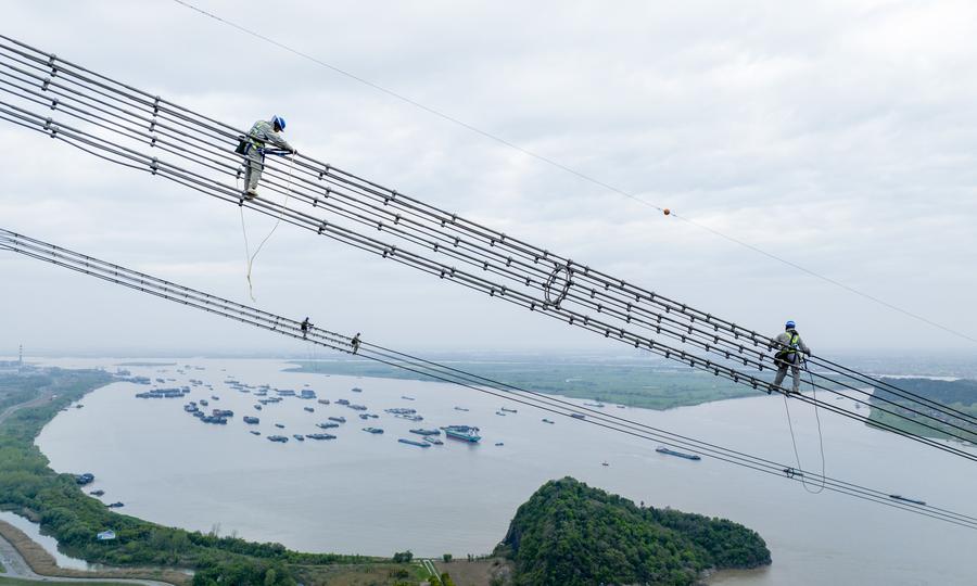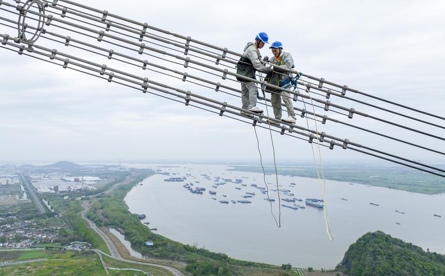 GLOBALINK | First-person view: Electrical workers inspect power transmission line over Yangtze River -Xinhua