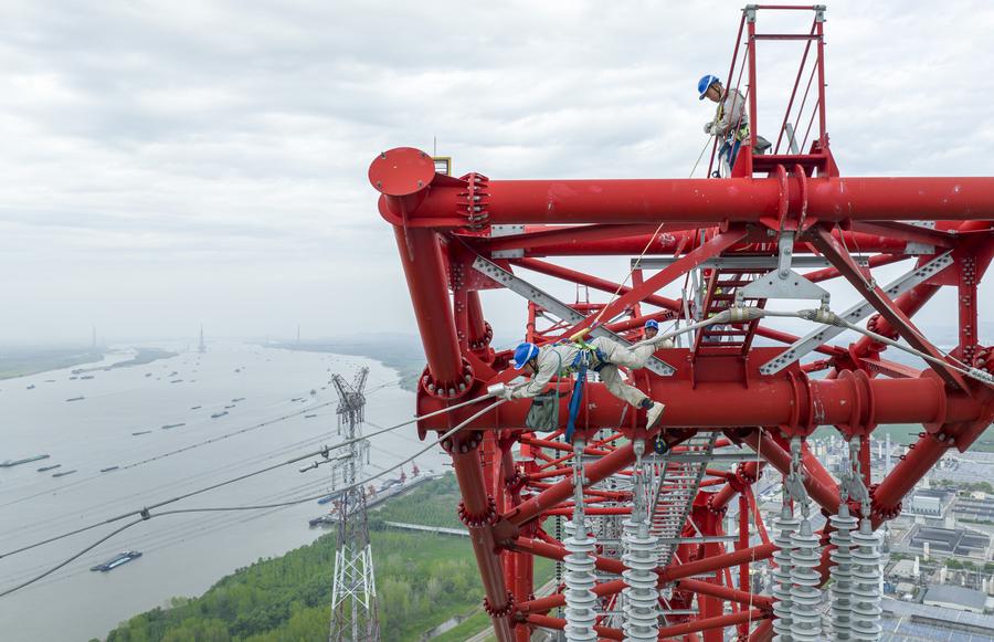 WUHU, June 3 (Xinhua) -- Stretching 2,080 kilometers, the ±800 kV ultra-high voltage direct current transmission line between southwest China's Sichuan Province and east China's Jiangsu Province spans the Yangtze River here in Anhui. As a critical part of China's west-to-east power transmission project, this line annually transmits over 30 billion kWh of clean power.