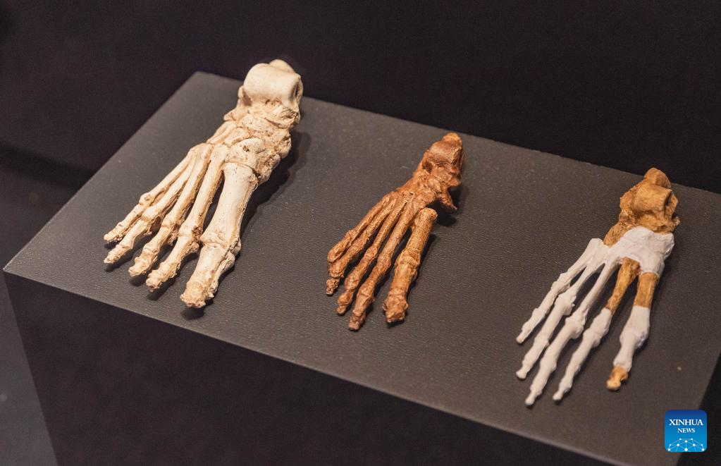 This photo taken on June 7, 2024 shows a replica of the "Little Foot" fossil skeleton at the Maropeng exhibition center, located in the Cradle of Humankind World Heritage Site, in Gauteng Province, South Africa.