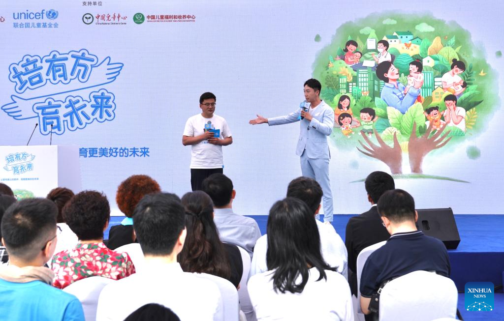 A volunteer from northwest China's Gansu Province shares his experience during a public campaign held in Beijing, capital of China, June 7, 2024. A new public campaign was jointly launched by the United Nations Children's Fund (UNICEF) and the Center for Women and Children's Health of the National Health Commission (NHC) and other partners on Friday to give children the best start in life.