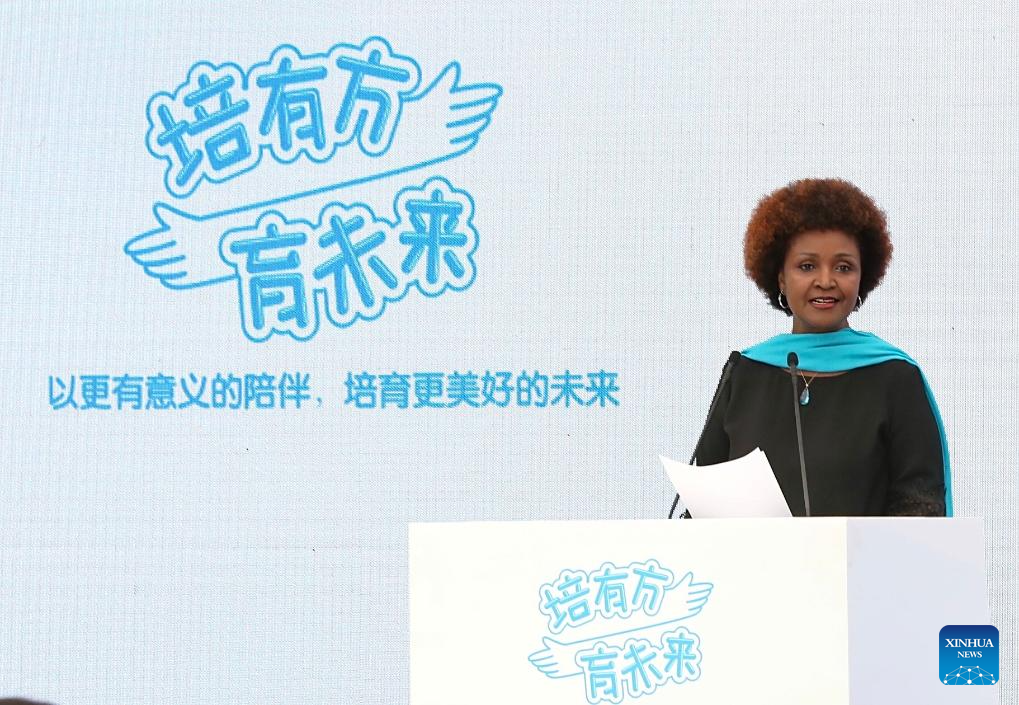 The United Nations Children's Fund (UNICEF) Representative to China Amakobe Sande addresses a public campaign held in Beijing, capital of China, June 7, 2024. A new public campaign was jointly launched by the United Nations Children's Fund (UNICEF) and the Center for Women and Children's Health of the National Health Commission (NHC) and other partners on Friday to give children the best start in life.