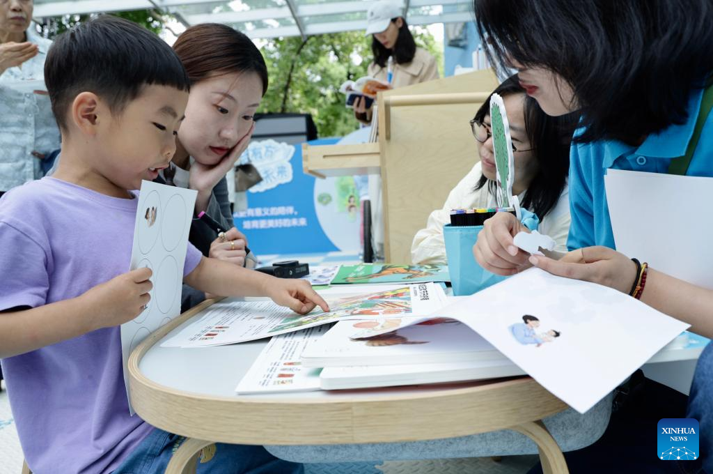 A mother and her son take part in a parents-child activity during a public campaign held in Beijing, capital of China, June 7, 2024. A new public campaign was jointly launched by the United Nations Children's Fund (UNICEF) and the Center for Women and Children's Health of the National Health Commission (NHC) and other partners on Friday to give children the best start in life.