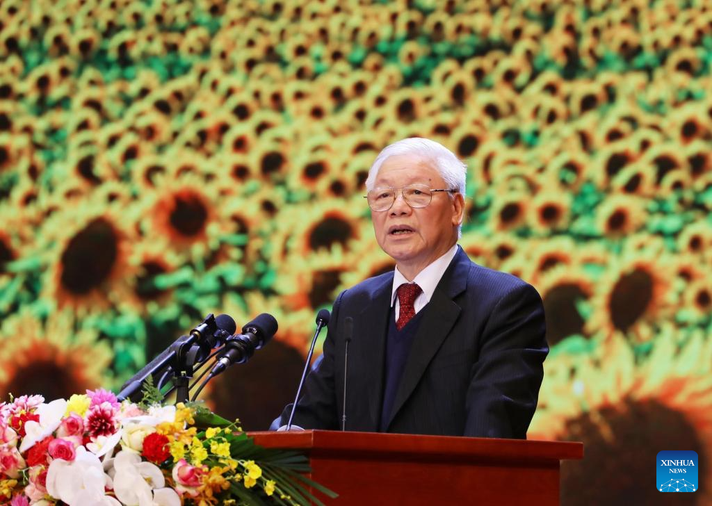 This file photo taken on Feb. 3, 2020 shows Nguyen Phu Trong speaking at a grand rally in celebration of the 90th founding anniversary of the Communist Party of Vietnam (CPV) in Hanoi, Vietnam. Nguyen Phu Trong, general secretary of the Communist Party of Vietnam Central Committee, passed away at the age of 80, Vietnam News Agency reported on Friday. (VNA via Xinhua)