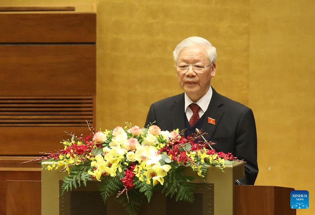This file photo taken on March 24, 2021 shows General Secretary of the Communist Party of Vietnam Central Committee (CPVCC) and then Vietnamese President Nguyen Phu Trong delivering a report at the opening session of the 11th session of the 14th National Assembly (NA) of Vietnam in Hanoi, Vietnam. Nguyen Phu Trong passed away at the age of 80, Vietnam News Agency reported on Friday. (VNA via Xinhua)