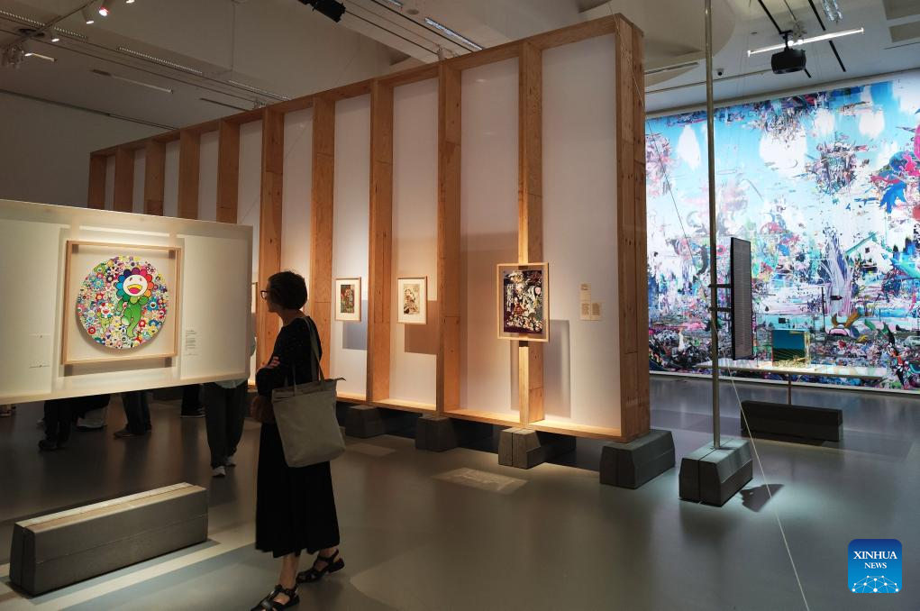 A visitor views an artwork during an exhibition on the Japanese pop culture tradition at National Gallery of Art in Vilnius, Lithuania, on July 24, 2024. Titled Beauties, Ghosts, and Samurai--The Japanese Pop Culture Tradition from Edo Ukiyo-e to Manga, Anime, and Supa Furatto in the 20th and 21st Centuries, the exhibition is held here from July 19 to Oct. 13, presenting works of more than 70 artists. (Photo by Yang Weihua/Xinhua)