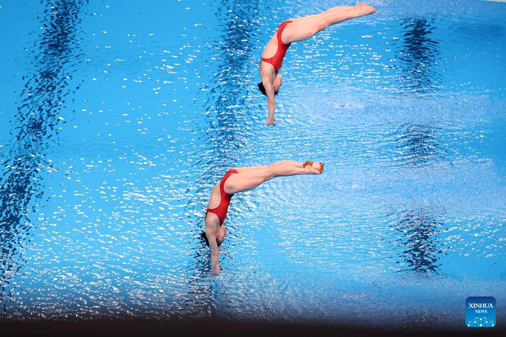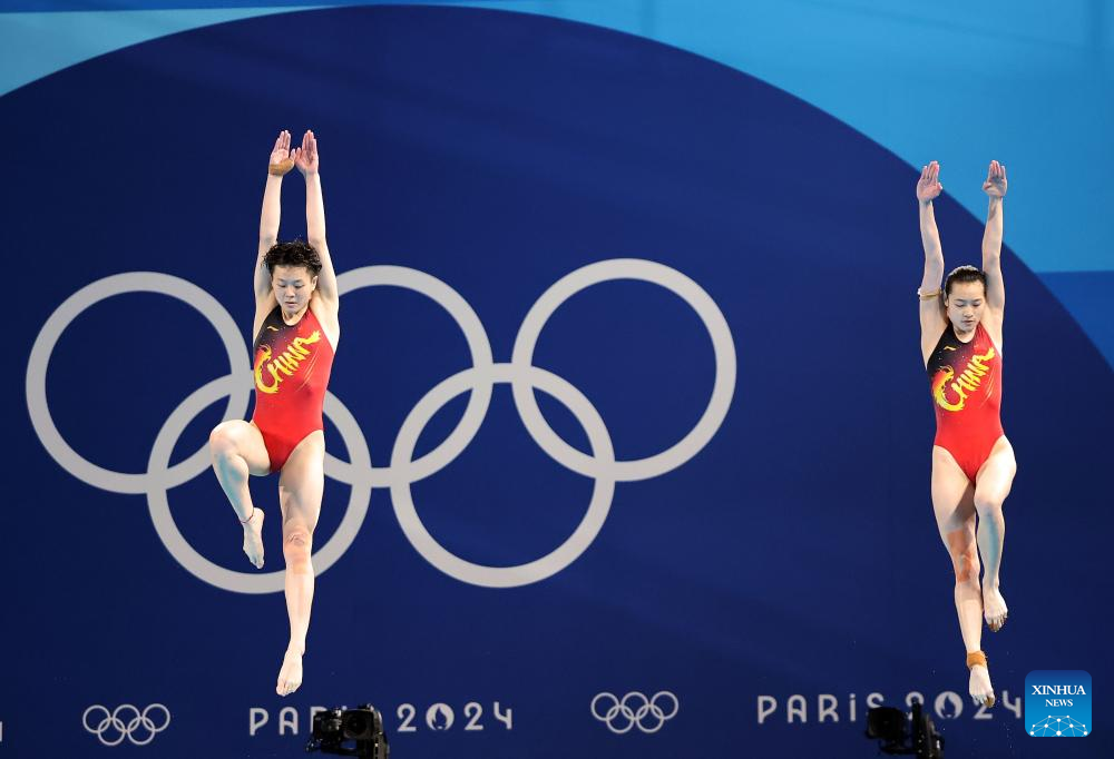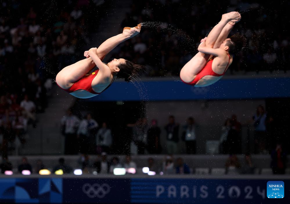 Chang Yani (L)/Chen Yiwen of China compete during the women's synchronised 3m springboard final of diving at the Paris 2024 Olympic Games in Saint Denis, near Paris, France, on July 27, 2024. (Xinhua/Li Ming)