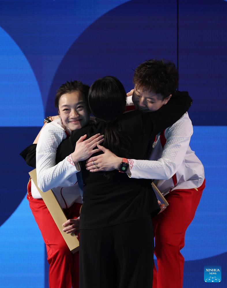 Silver medalists Sarah Bacon/Kassidy Cook of the United States, gold medalists Chang Yani/Chen Yiwen of China and bronze medalists Yasmin Harper/Scarlett Mew Jensen of Britain (L to R) attend the awarding ceremony after the women's synchronised 3m springboard final of diving at the Paris 2024 Olympic Games in Saint Denis, near Paris, France, on July 27, 2024. (Xinhua/Zhang Yuwei)