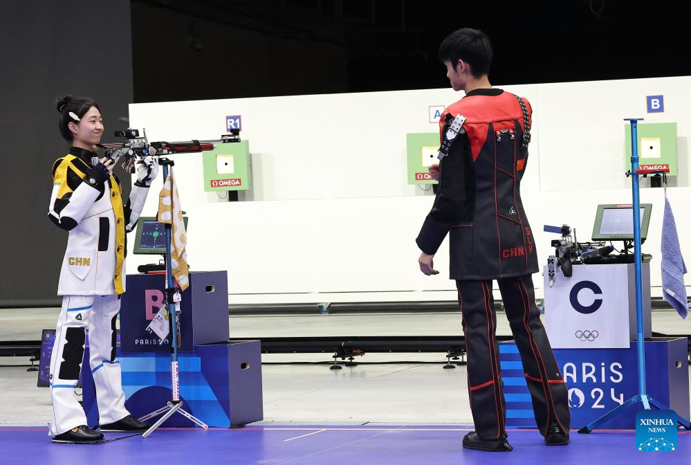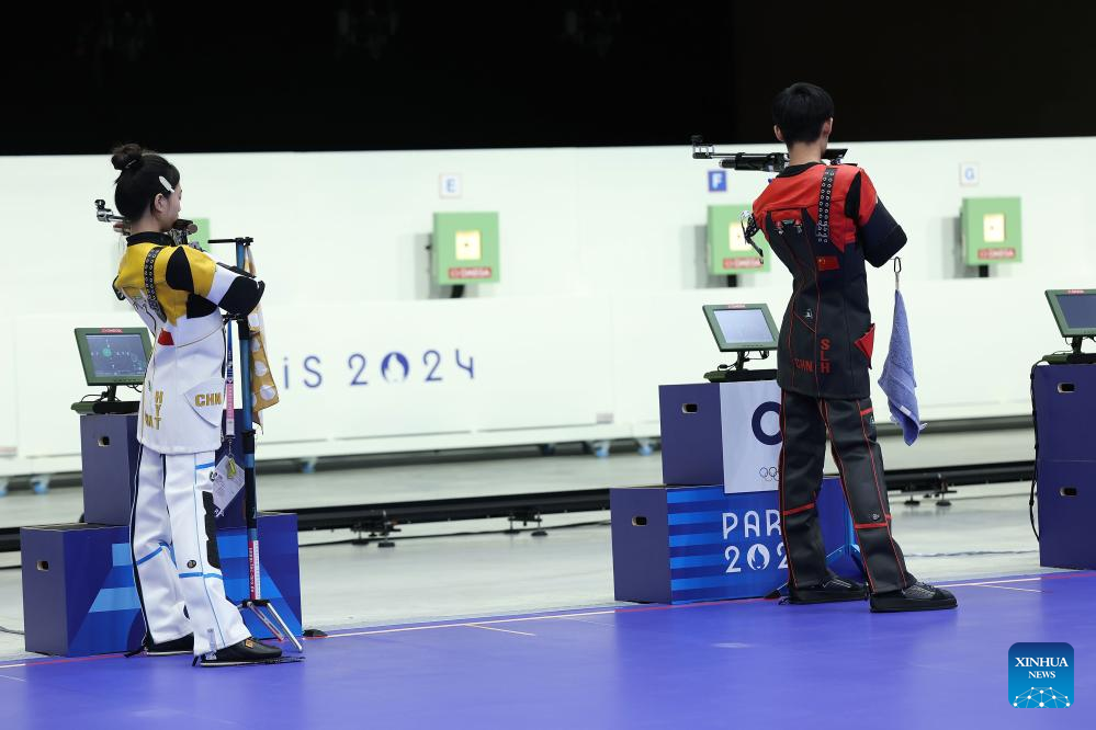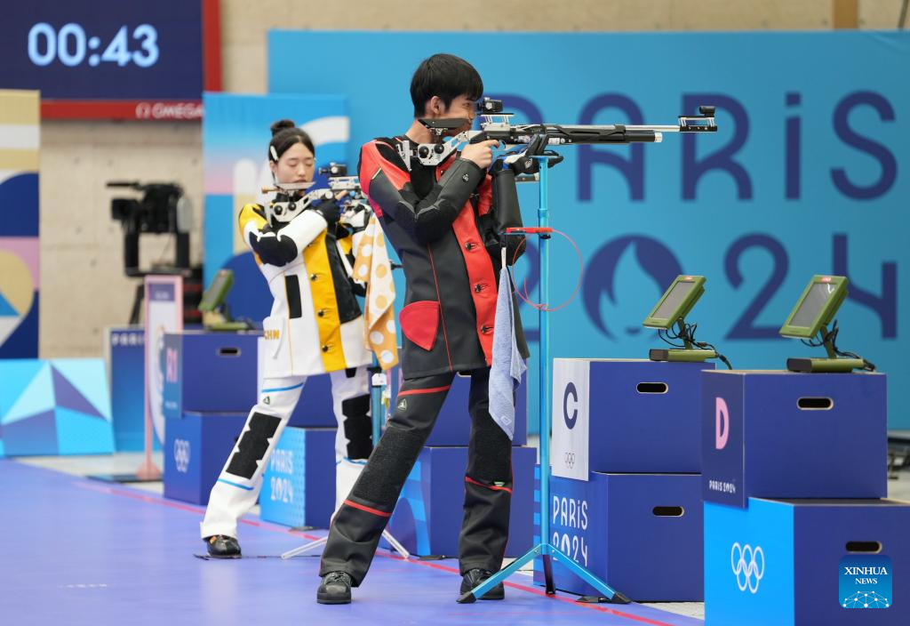 Huang Yuting (L)/Sheng Lihao of China compete during the 10m air rifle mixed team gold medal match of shooting between China and South Korea at the Paris 2024 Olympic Games in Chateauroux, France, on July 27, 2024. (Xinhua/Ju Huanzong)