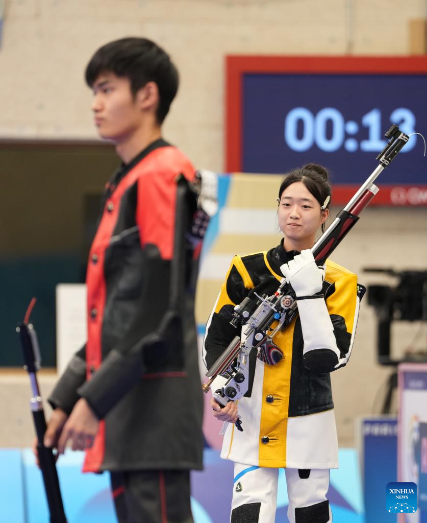 Huang Yuting (L)/Sheng Lihao of China compete during the 10m air rifle mixed team gold medal match of shooting between China and South Korea at the Paris 2024 Olympic Games in Chateauroux, France, on July 27, 2024. (Xinhua/Zhao Dingzhe)