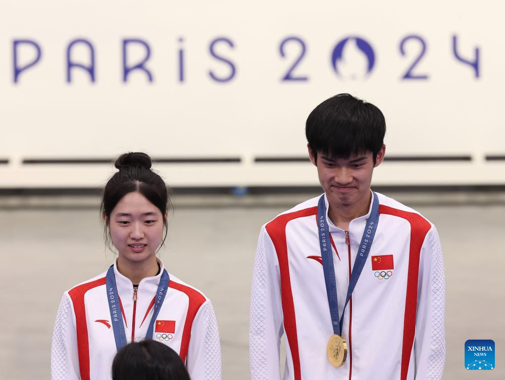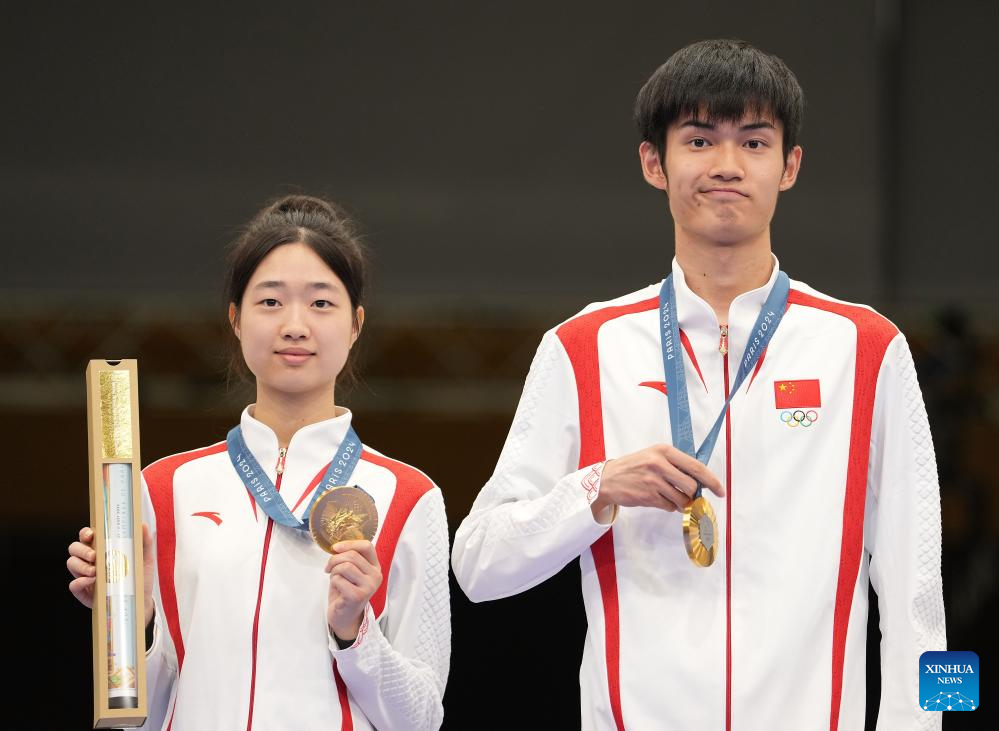 Gold medalists Huang Yuting (L)/Sheng Lihao of China attend the awarding ceremony after the 10m air rifle mixed team gold medal match of shooting at the Paris 2024 Olympic Games in Chateauroux, France, on July 27, 2024. (Xinhua/Zhang Fan)