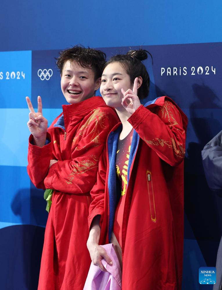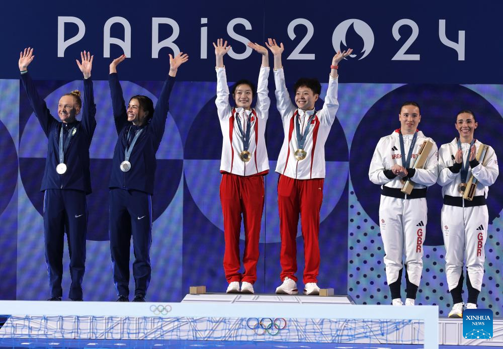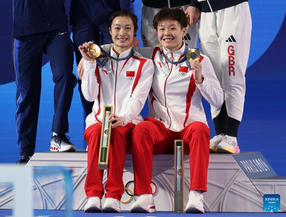 Gold medalists Chang Yani (L)/Chen Yiwen of China pose for photos during the awarding ceremony after the women's synchronised 3m springboard final of diving at the Paris 2024 Olympic Games in Saint Denis, near Paris, France, on July 27, 2024. (Xinhua/Li Ying)