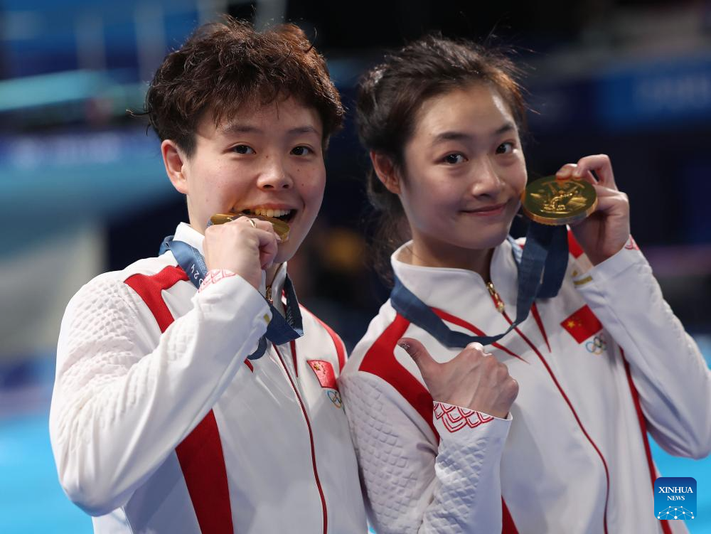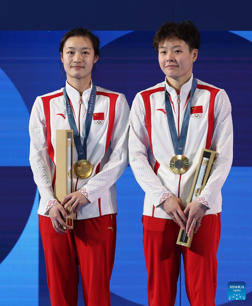 Gold medalists Chang Yani (L)/Chen Yiwen of China attend the awarding ceremony after the women's synchronised 3m springboard final of diving at the Paris 2024 Olympic Games in Saint Denis, near Paris, France, on July 27, 2024. (Xinhua/Li Ying)