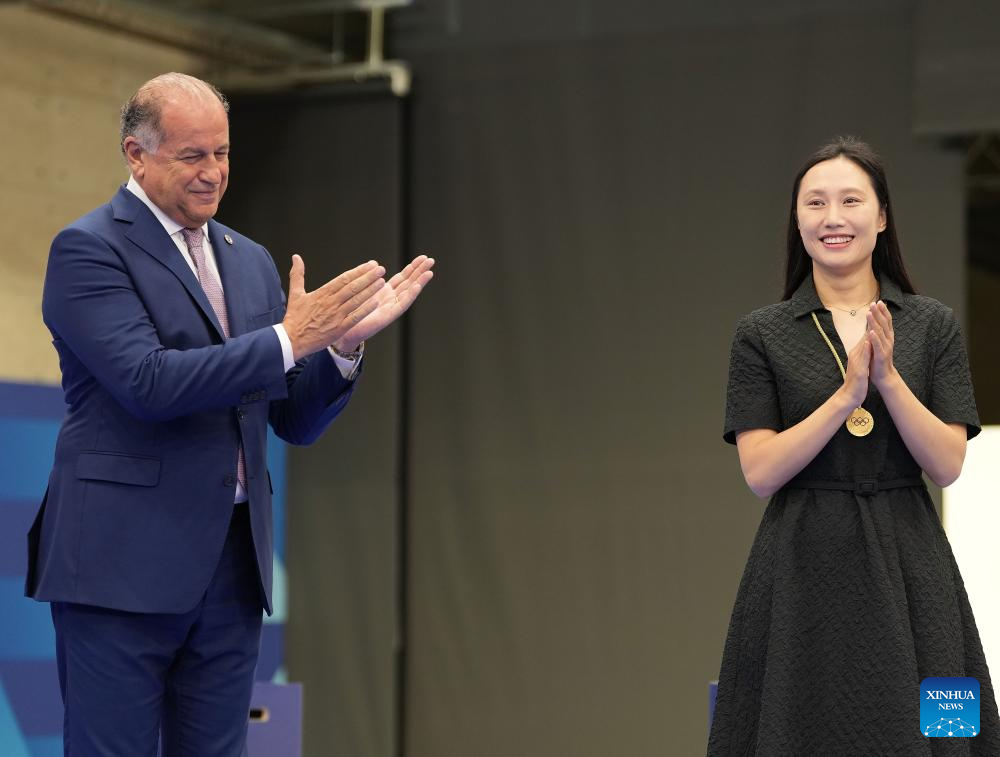 President of the International Shooting Sport Federation Luciano Rossi (L) and International Olympic Committee (IOC) member Zhang Hong attend the awarding ceremony after the 10m air rifle mixed team gold medal match of shooting at the Paris 2024 Olympic Games in Chateauroux, France, on July 27, 2024. (Xinhua/Ju Huanzong)