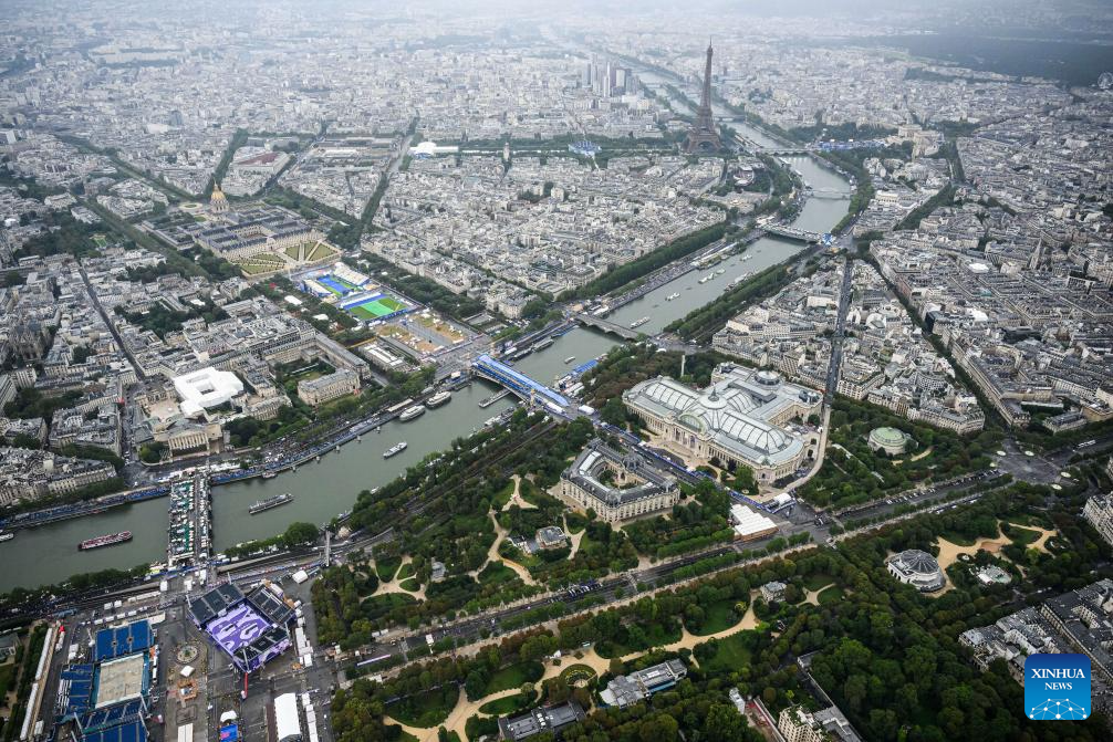 This photo taken from an helicopter on July 26, 2024 shows an aerial view of the Eiffel Tower (rear C) and the Grand Palais (front R) during the opening ceremony of the Paris 2024 Olympic Games in Paris, France. (Photo by Lionel Bonaventure/POOL/Xinhua)