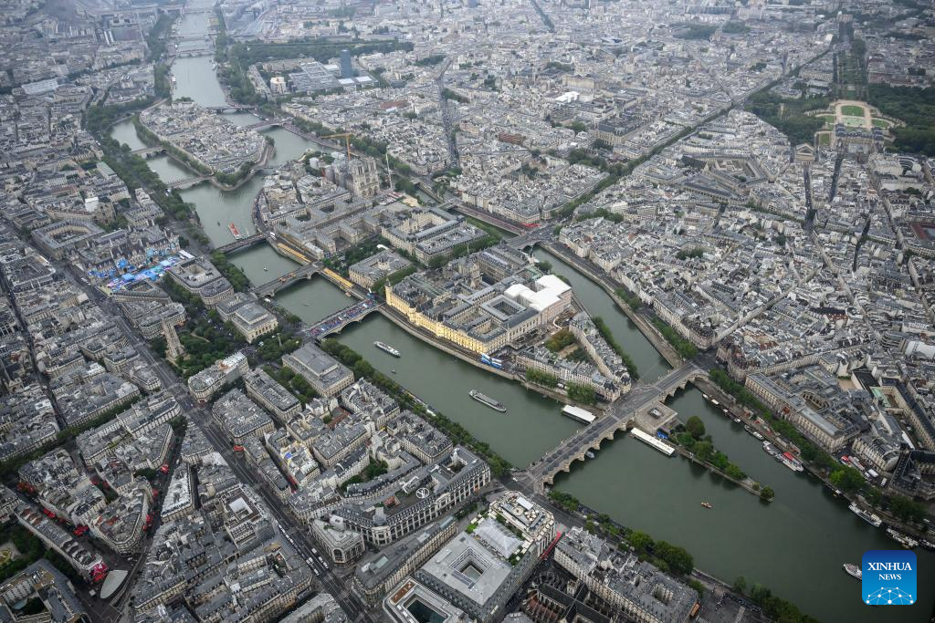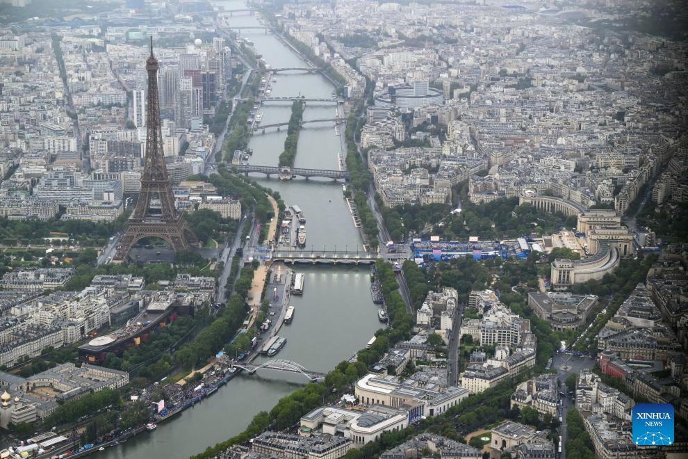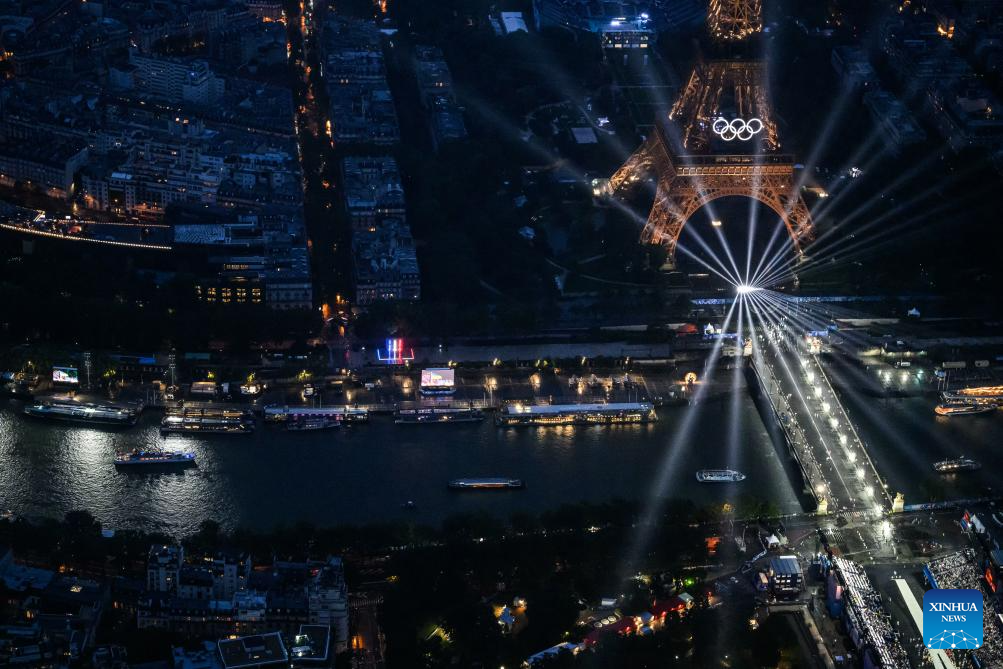 This photo taken from an helicopter on July 26, 2024 shows an aerial view of the Eiffel Tower along the Seine river during the opening ceremony of the Paris 2024 Olympic Games in Paris, France. (Photo by Lionel Bonaventure/POOL/Xinhua)