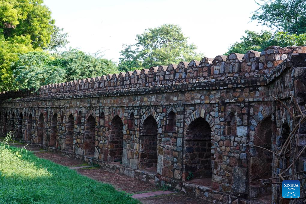 This photo taken on July 29, 2024 shows red sandstone walls surrounding the Humayun's Tomb in New Delhi, India.