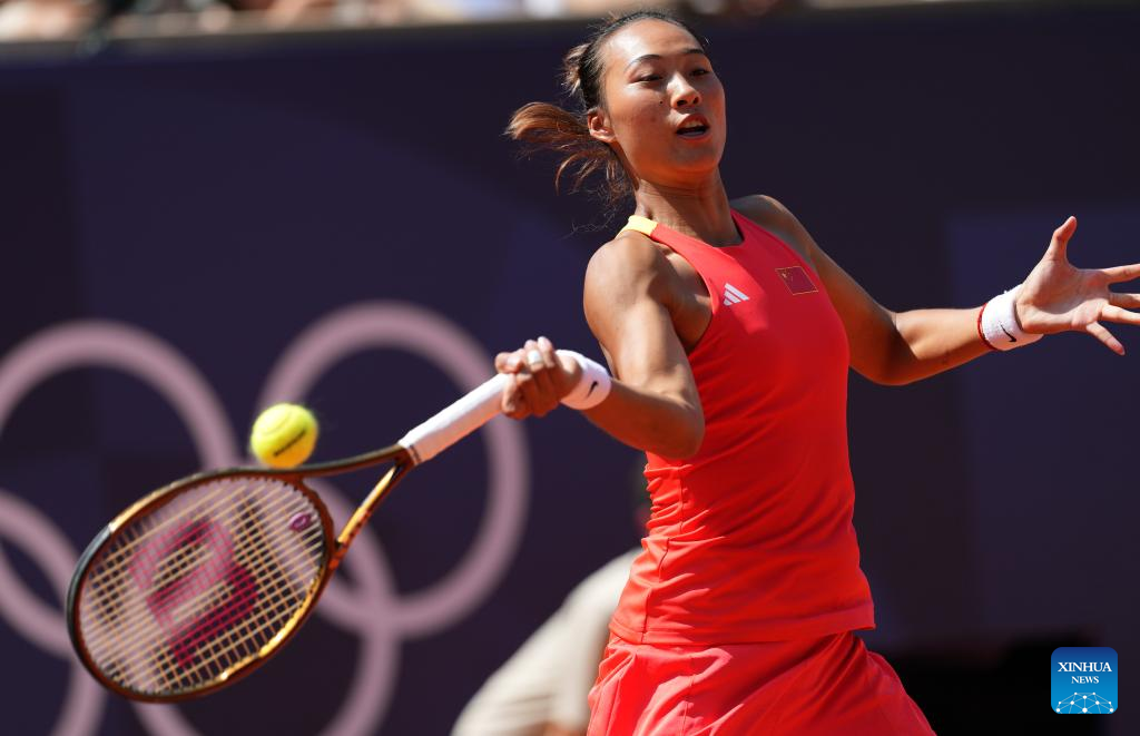 Zheng Qinwen of China competes during the women's singles semi-final match of tennis between Zheng Qinwen of China and Iga Swiatek of Poland at the Paris 2024 Olympic Games in Paris, France, on Aug. 1, 2024. (Xinhua/Wan Xiang)