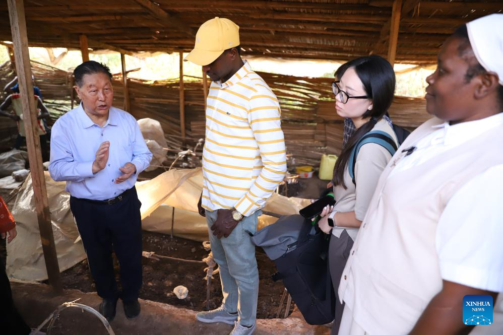 Lin Zhanxi (L), a professor from China's Fujian Agriculture and Forestry University, visits a mushroom growing shed in Kigali, Rwanda, on Aug. 2, 2024. (Xinhua/Ji Li)