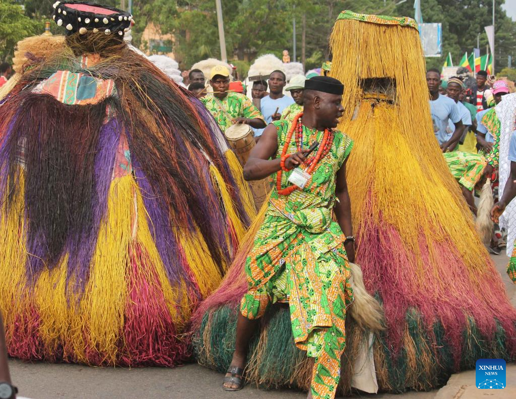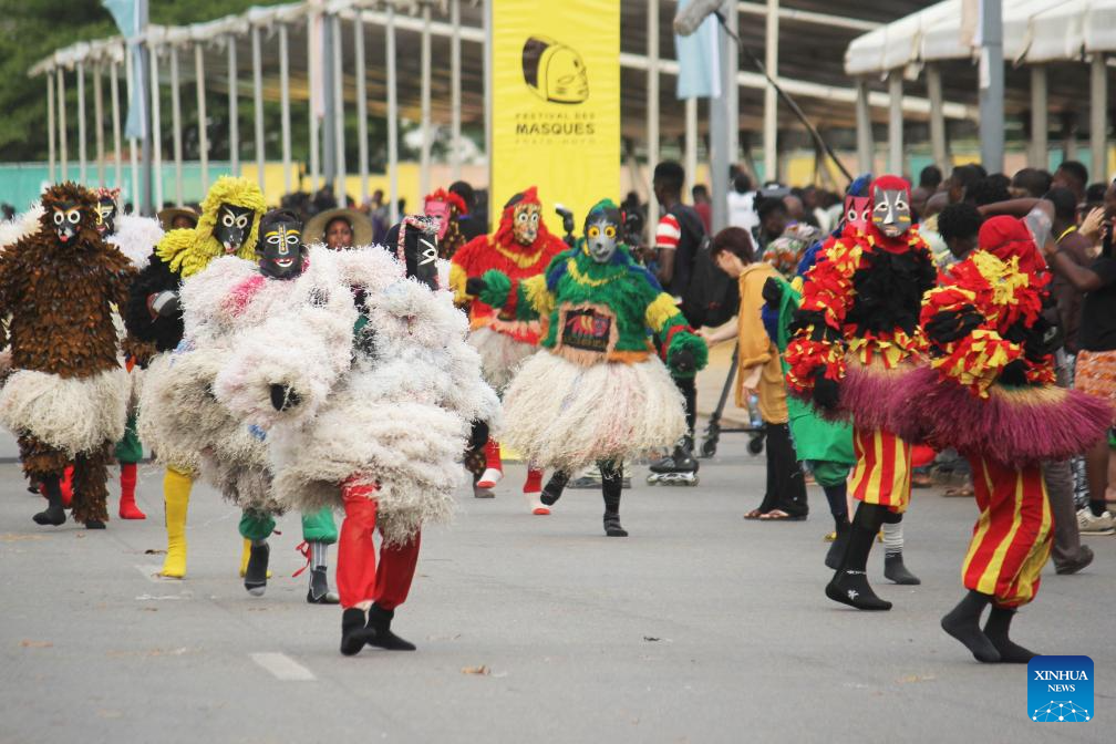 People in costumes perform in a mask parade during the Porto Novo Mask Festival in Porto Novo, Benin, Aug. 4, 2024. The festival was held here from Friday to Sunday to showcase the art and culture of Benin's traditional religion Vodun through a mask parade, concerts, seminars and other activities. (Photo by Seraphin Zounyekpe/Xinhua)