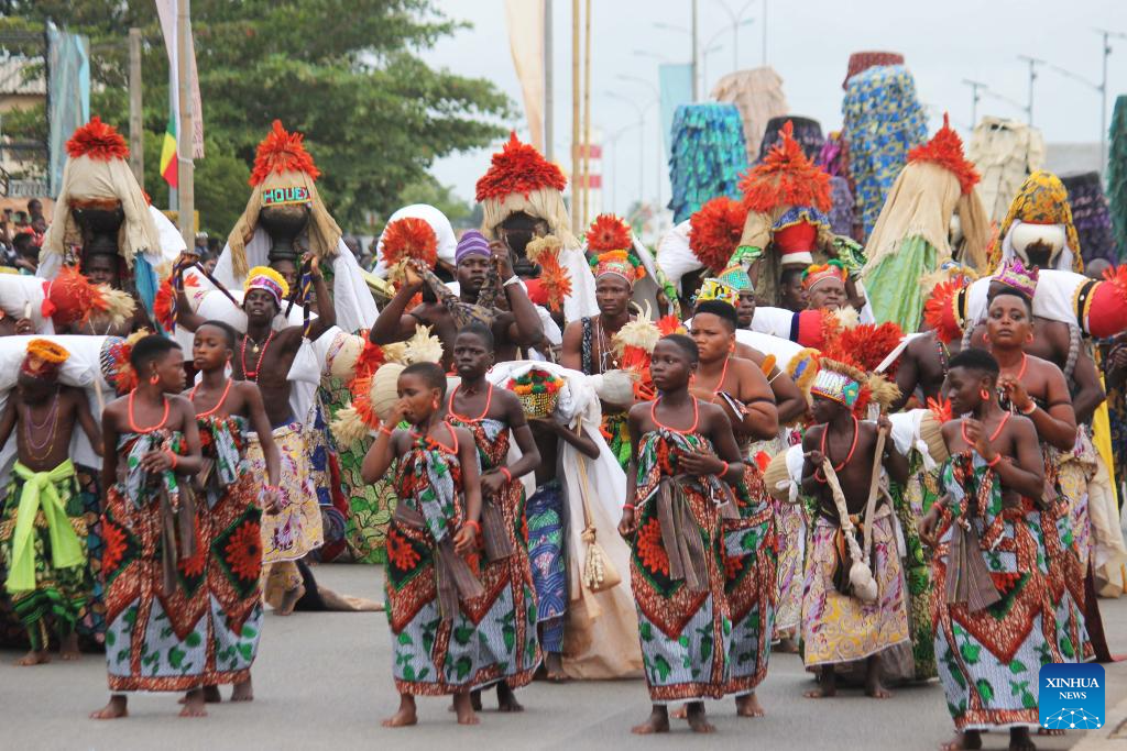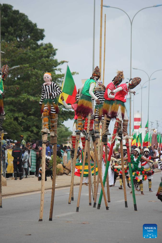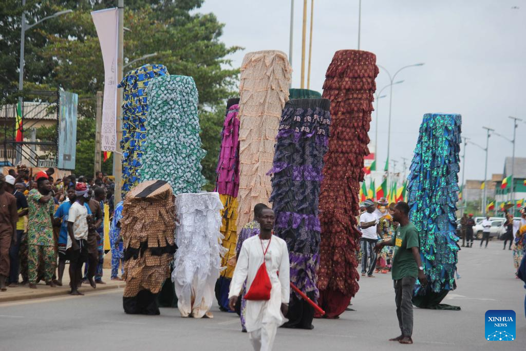 People in costumes perform on stilts in a mask parade during the Porto Novo Mask Festival in Porto Novo, Benin, Aug. 4, 2024. The festival was held here from Friday to Sunday to showcase the art and culture of Benin's traditional religion Vodun through a mask parade, concerts, seminars and other activities. (Photo by Seraphin Zounyekpe/Xinhua)