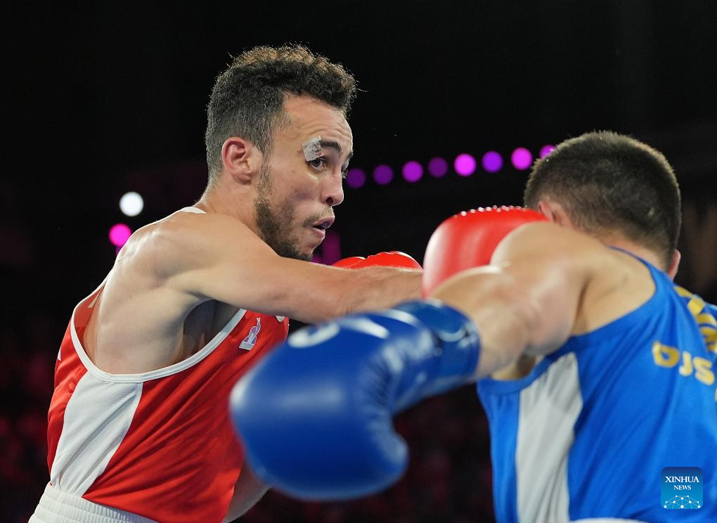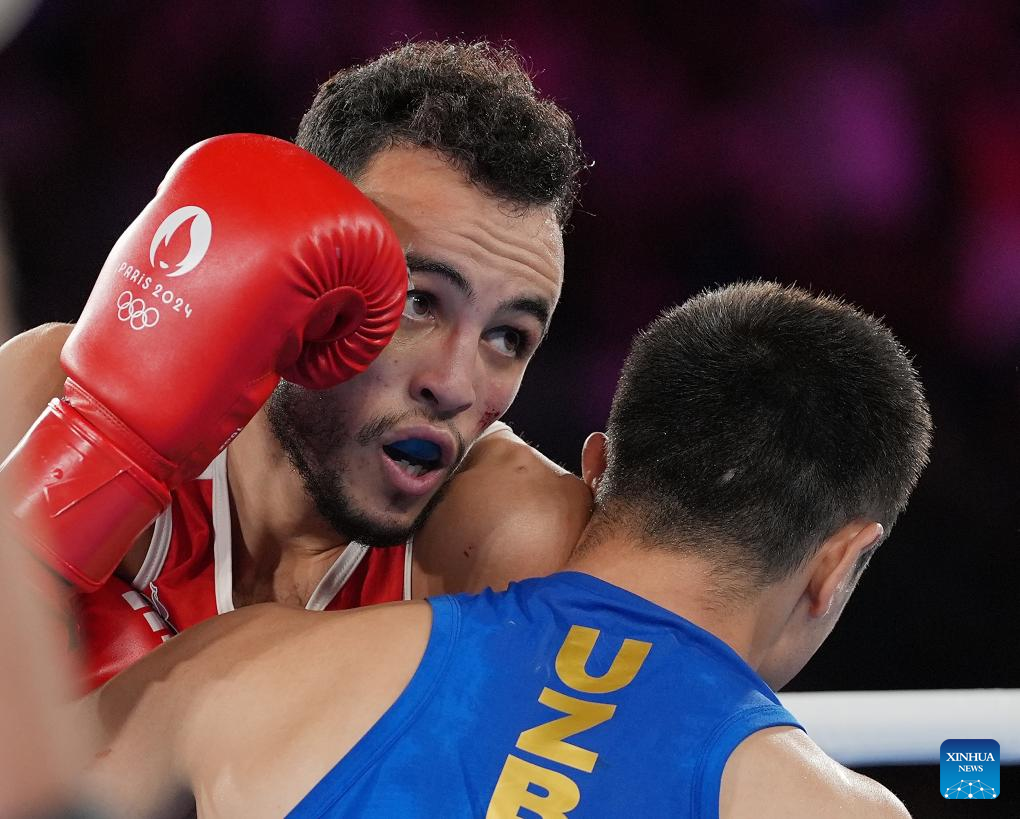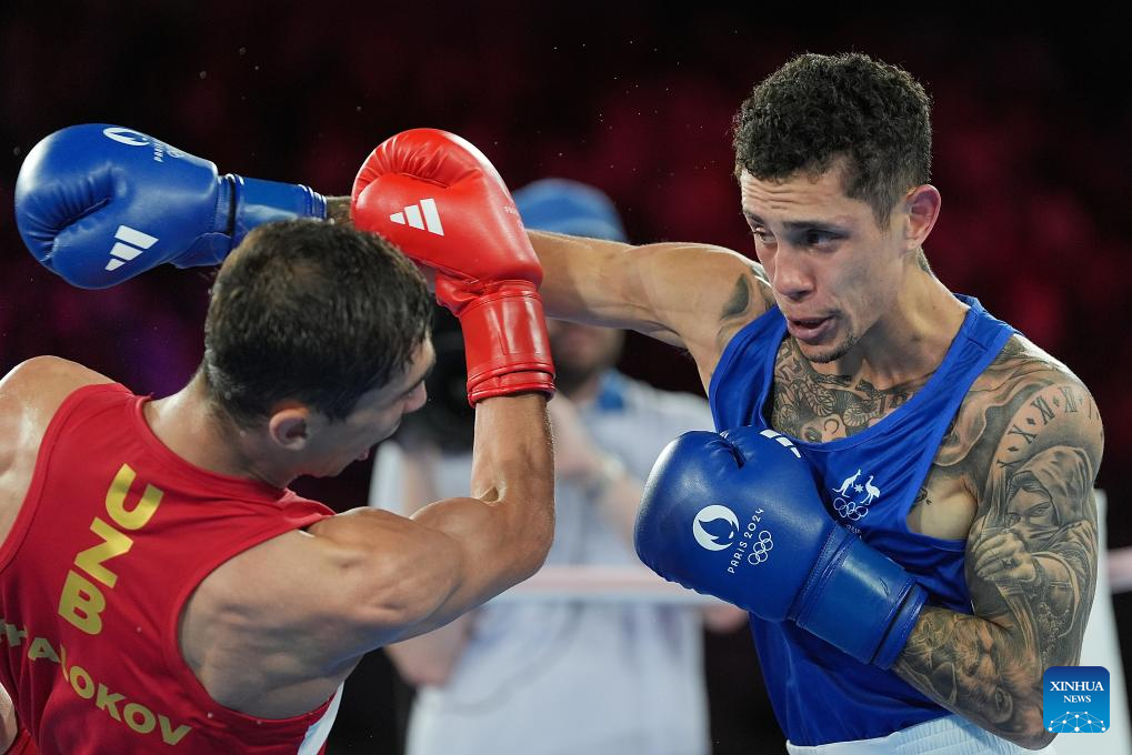 Abdumalik Khalokov of Uzbekistan (in red) competes with Charlie Senior of Australia during the men's boxing 57kg semifinal at the Paris 2024 Olympic Games in Paris, France, Aug. 8, 2024. (Xinhua/Jiang Wenyao)