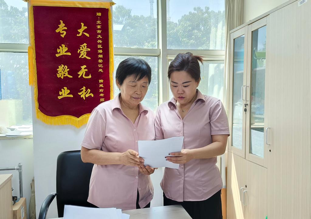 This photo taken with a mobile phone shows Sui Yanling (L) and her colleague working in the marriage registration center in Daxing District of Beijing, capital of China, Aug. 5, 2024. (Xinhua/Ren Chao)