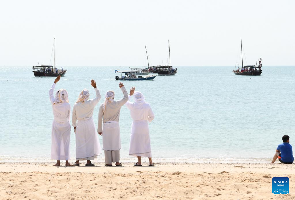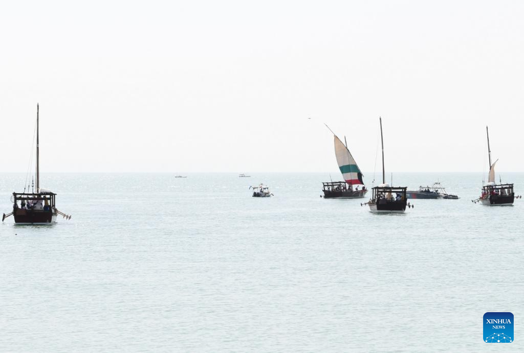 Dhow boats carrying divers are pictured during the inauguration of the 33rd Pearl Diving Festival at a dock in Al-Salmiya, Hawalli Governorate, Kuwait, Aug. 10, 2024. The 33rd Pearl Diving Festival kicked off here Saturday, with up to 150 young sailors and divers boarding several dhow boats to embark on a pearl-finding trip that lasts for 6 days. (Photo by Asad/Xinhua)