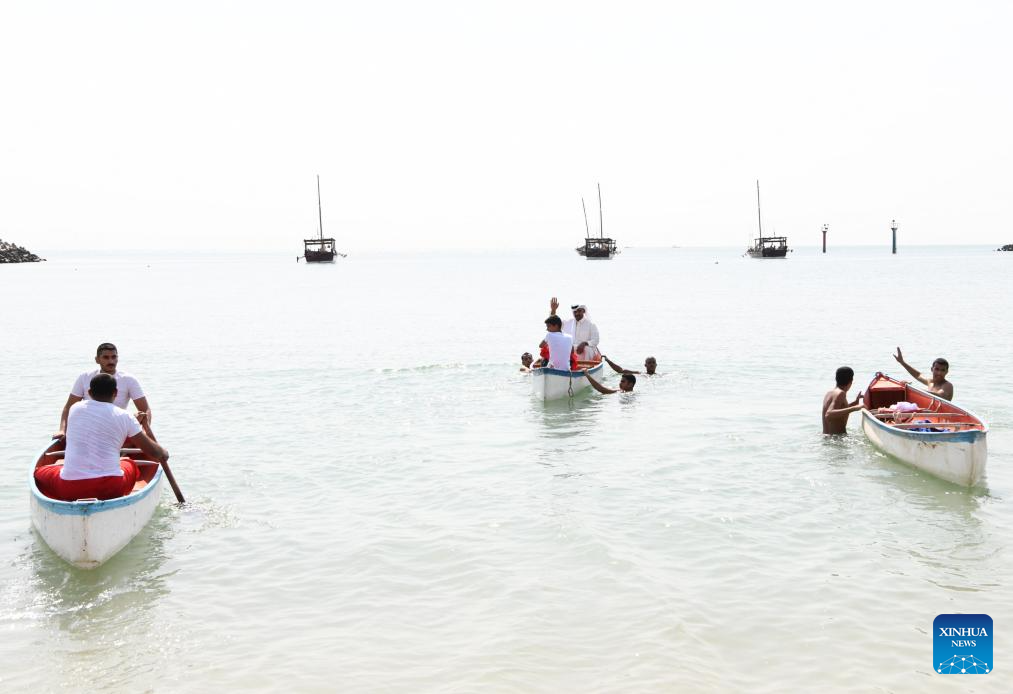 Sailors and divers head to dhow boats during the inauguration of the 33rd Pearl Diving Festival at a dock in Al-Salmiya, Hawalli Governorate, Kuwait, Aug. 10, 2024. The 33rd Pearl Diving Festival kicked off here Saturday, with up to 150 young sailors and divers boarding several dhow boats to embark on a pearl-finding trip that lasts for 6 days. (Photo by Asad/Xinhua)