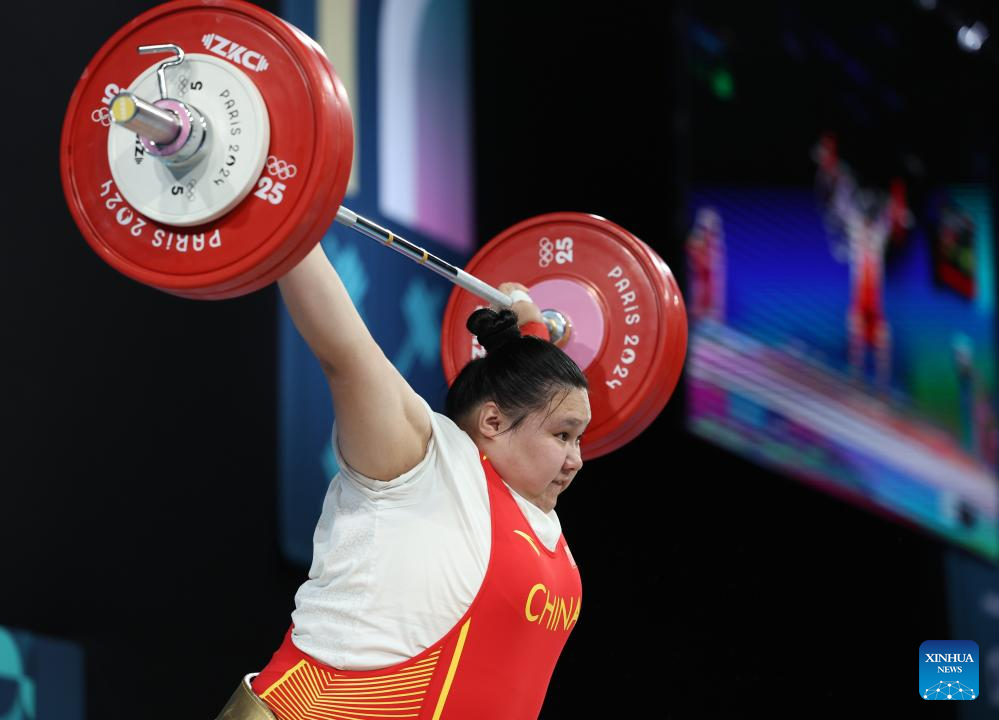 Li Wenwen of China competes during the weightlifting women's +81kg competition at the Paris 2024 Olympic Games in Paris, France, on Aug. 11, 2024. (Xinhua/Zheng Huansong)