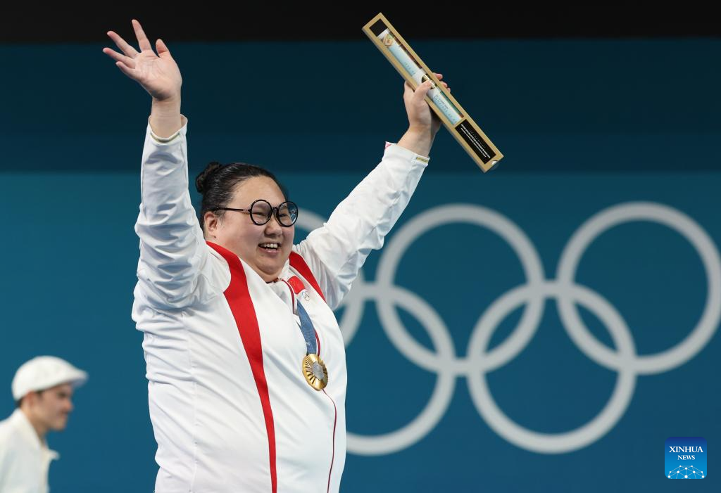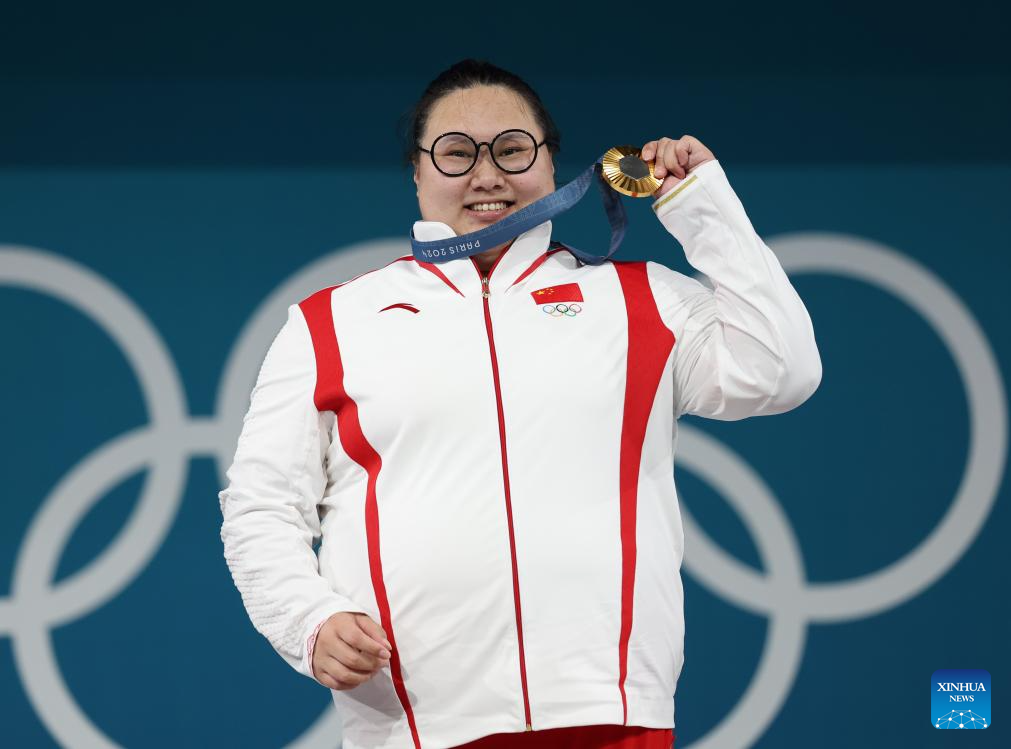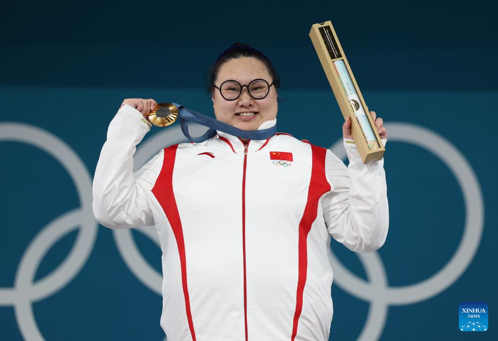 Gold medalist Li Wenwen of China attends the awarding ceremony after the weightlifting women's +81kg competition at the Paris 2024 Olympic Games in Paris, France, on Aug. 11, 2024. (Xinhua/Yang Lei)