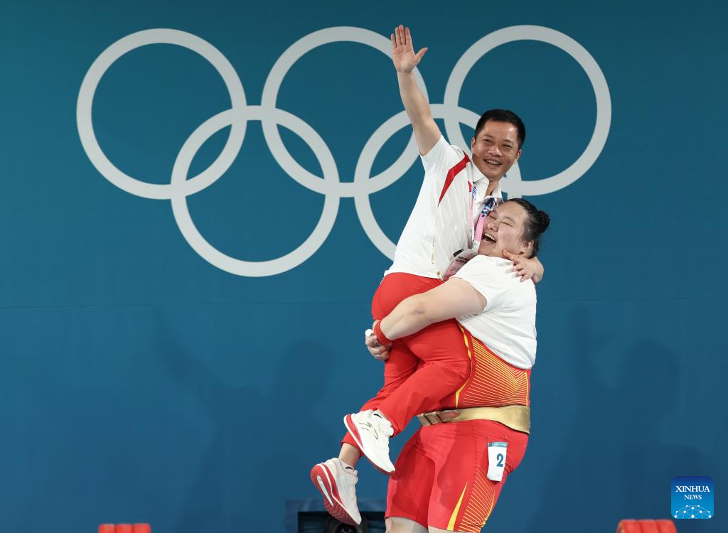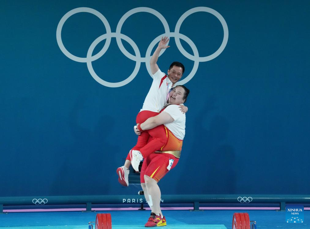 China's Li Wenwen (R) celebrates with her coach Wu Meijin after the weightlifting women's +81kg competition at the Paris 2024 Olympic Games in Paris, France, on Aug. 11, 2024. (Xinhua/Yang Lei)