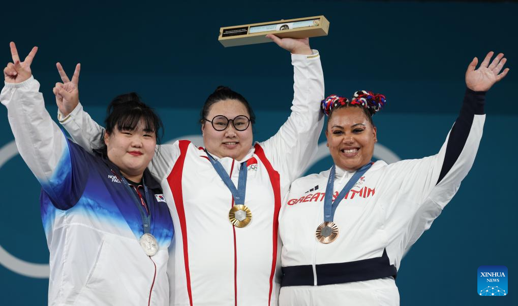 Gold medalist Li Wenwen (C) of China, silver medalist Park Hyejeong (L) of South Korea and bronze medalist Emily Campbell of Great Britain attend the awarding ceremony after the weightlifting women's +81kg competition at the Paris 2024 Olympic Games in Paris, France, on Aug. 11, 2024. (Xinhua/Zheng Huansong)