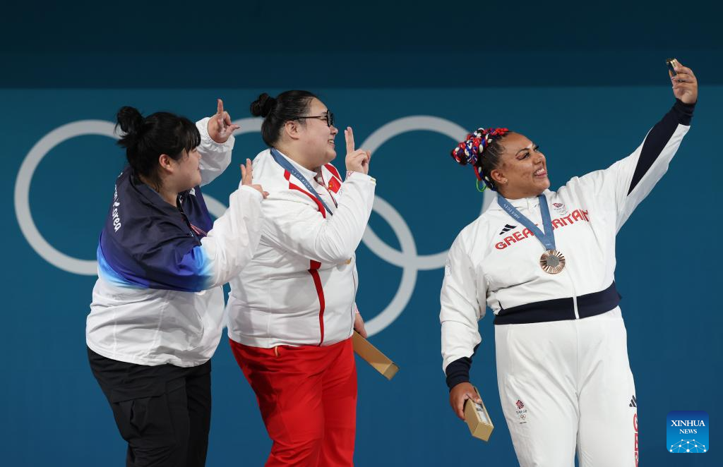 Gold medalist Li Wenwen (C) of China, silver medalist Park Hyejeong (L) of South Korea and bronze medalist Emily Campbell of Great Britain take selfies during the awarding ceremony after the weightlifting women's +81kg competition at the Paris 2024 Olympic Games in Paris, France, on Aug. 11, 2024. (Xinhua/Yang Lei)