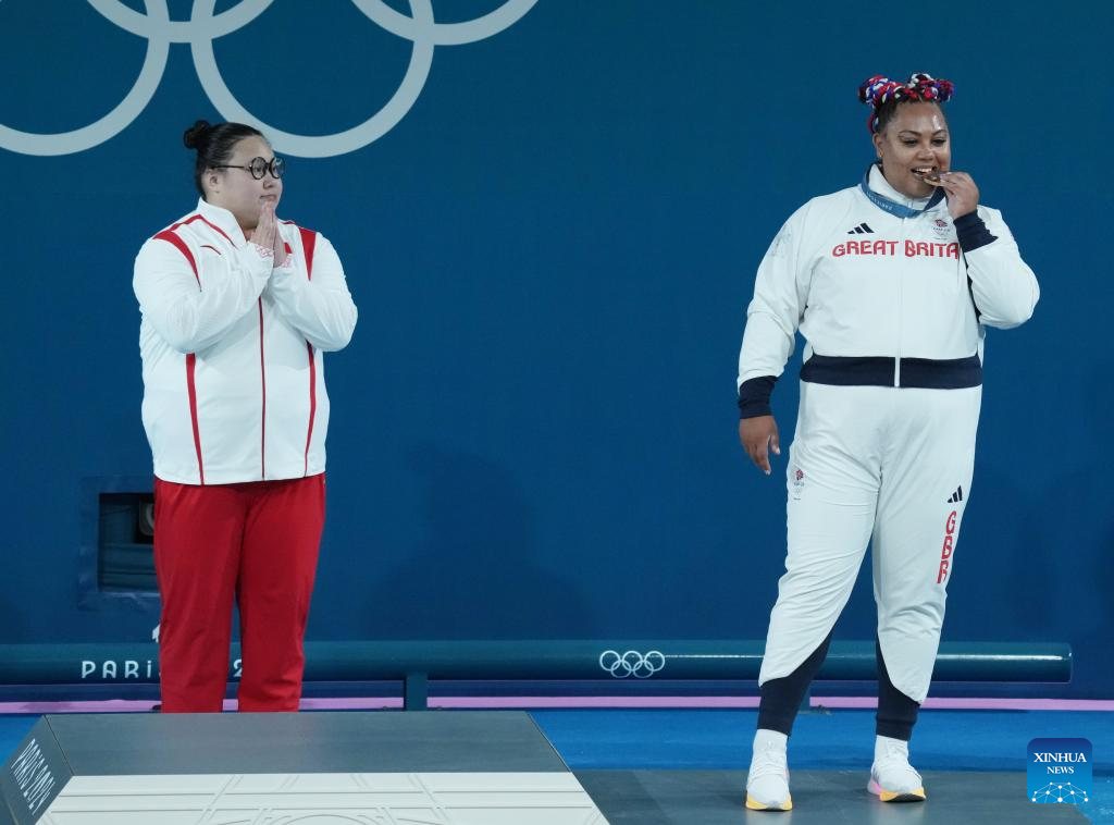 Gold medalist Li Wenwen (L) of China, bronze medalist Emily Campbell of Great Britain attend the awarding ceremony after the weightlifting women's +81kg competition at the Paris 2024 Olympic Games in Paris, France, on Aug. 11, 2024. (Xinhua/Zheng Huansong)