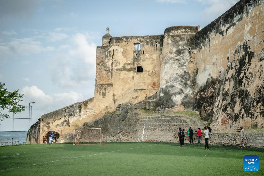 People play football and relax in the Old Town of Mombasa, Kenya, on Aug. 17, 2024. The Old Town of Mombasa, located on the southeast side of Mombasa Island, has become an important tourist destination in Kenya due to its diverse culture and historical sites. (Xinhua/Wang Guansen)