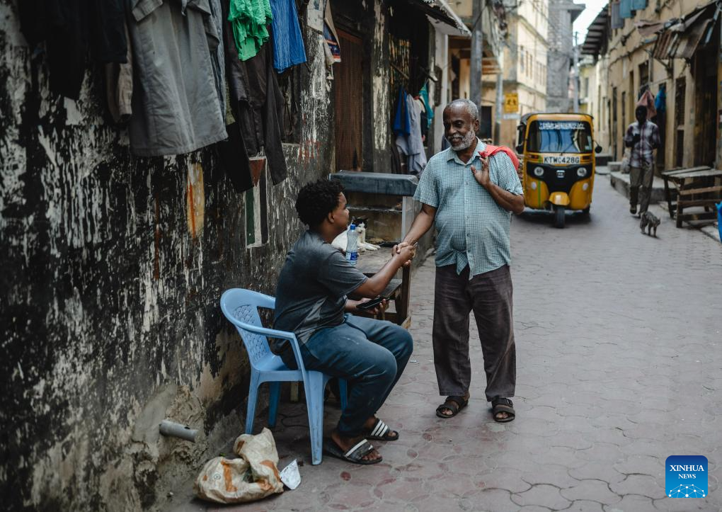 Citizens chat with each other in the Old Town of Mombasa, Kenya, on Aug. 17, 2024. The Old Town of Mombasa, located on the southeast side of Mombasa Island, has become an important tourist destination in Kenya due to its diverse culture and historical sites. (Xinhua/Wang Guansen)