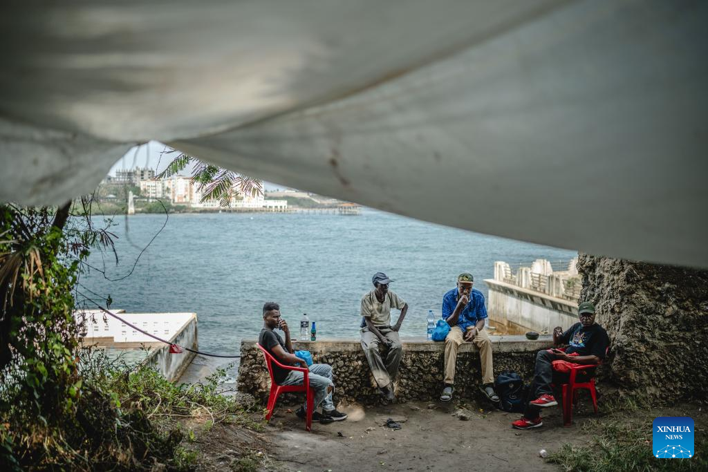 People relax on the coastal area of the Old Town of Mombasa, Kenya, on Aug. 17, 2024. The Old Town of Mombasa, located on the southeast side of Mombasa Island, has become an important tourist destination in Kenya due to its diverse culture and historical sites. (Xinhua/Wang Guansen)