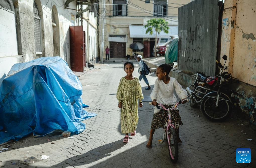 Children have fun in the Old Town of Mombasa, Kenya, on Aug. 17, 2024. The Old Town of Mombasa, located on the southeast side of Mombasa Island, has become an important tourist destination in Kenya due to its diverse culture and historical sites. (Xinhua/Wang Guansen)