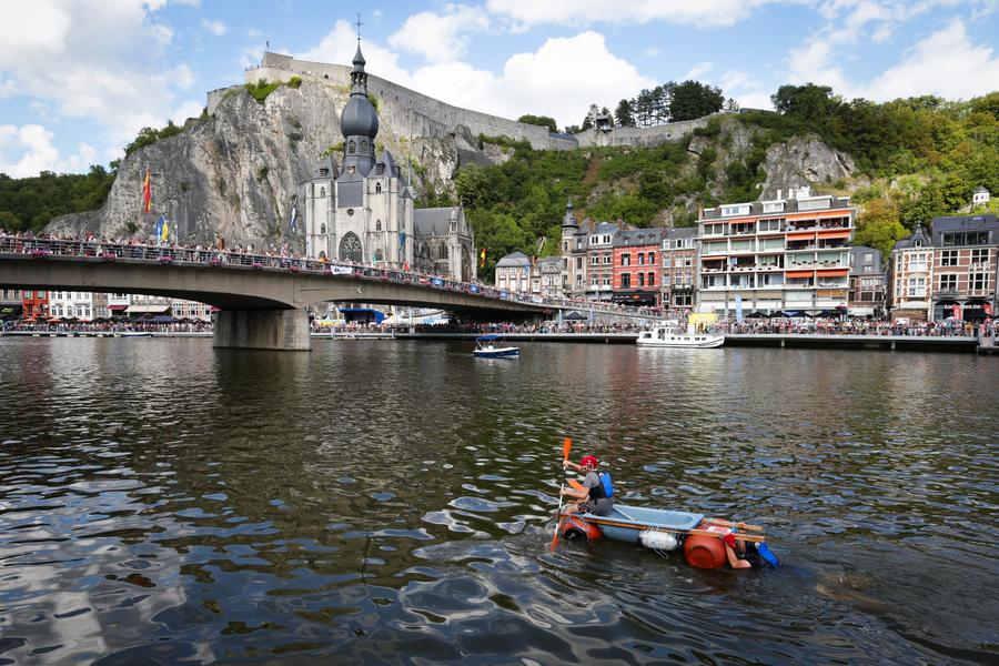 Participants take part in the International Bathtub Regatta on the Meuse River in Dinant, Belgium, on Aug. 15, 2023. Starting in 1982, participants vie to create the most impressive bathtub-based craft and compete down the Meuse River in Dinant on Aug. 15 each year. (Xinhua/Zheng Huansong)