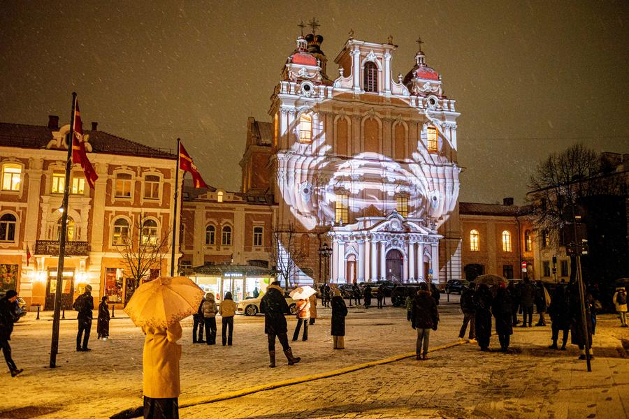 People view an illuminated building during the International Light Festival in Vilnius, Lithuania, on Jan. 25, 2024. (Photo by Alfredas Pliadis/Xinhua)