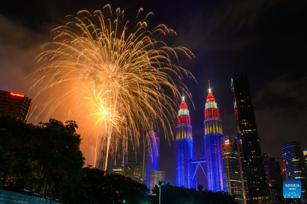 Fireworks explode above the Petronas Twin Towers in celebration of Malaysia's 67th anniversary of independence in Kuala Lumpur, Malaysia, Aug. 31, 2024. Malaysia marked the 67th anniversary of independence on Saturday, with a huge public turnout at the administration center of Putrajaya to mark the National Day. (Photo by Chong Voon Chung/Xinhua)