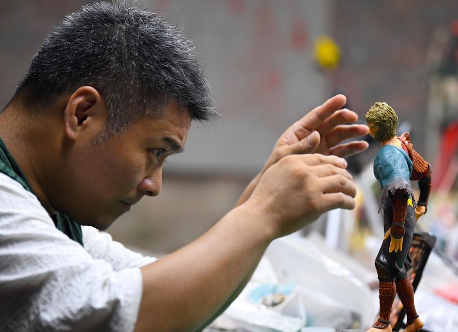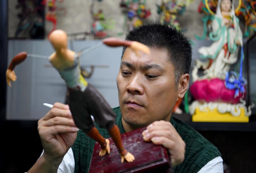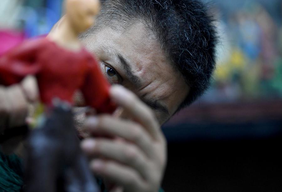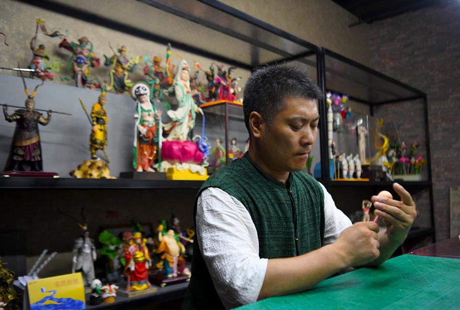 ZHENGZHOU, Aug. 31 (Xinhua) -- Song Zhanke, 46, is an inheritor of Song's dough sculpture, a renowned dough handicraft in Luoyang. Having lived by the profession for 20-plus years, the inheritor believes that the figure's body-head proportion, gestures, and facial expressions hold the key to this craft.